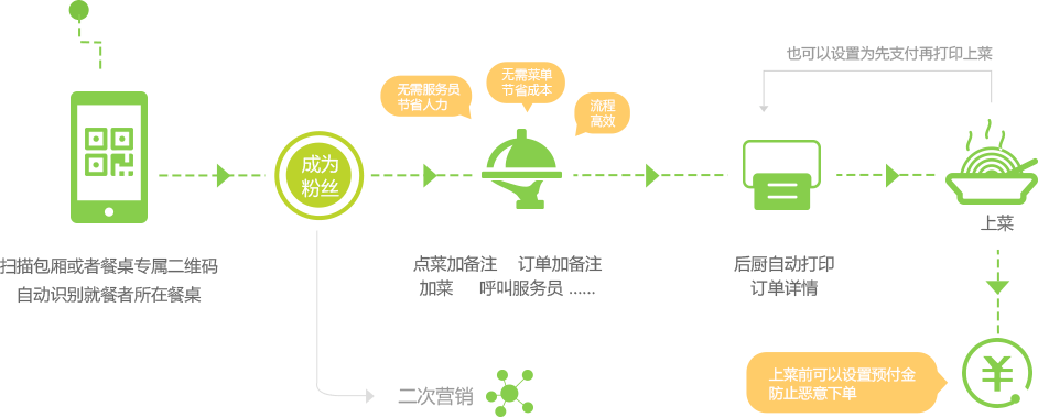 免去叫服务员的麻烦,顾客通过微信即可自助下单,商家POS实时收到订单,确认后即可下发到厨房