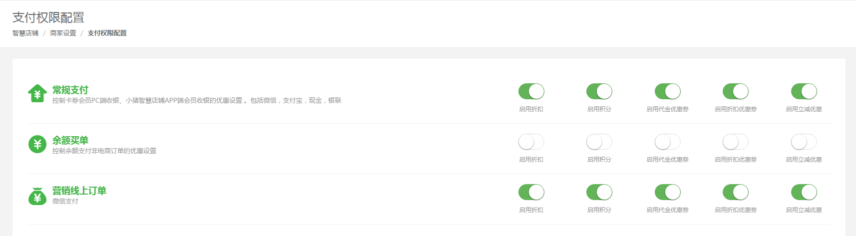 比如支付时是否启用积分、是否启用折扣、是否启用下单立减等等,商家均能在此处统一配置。