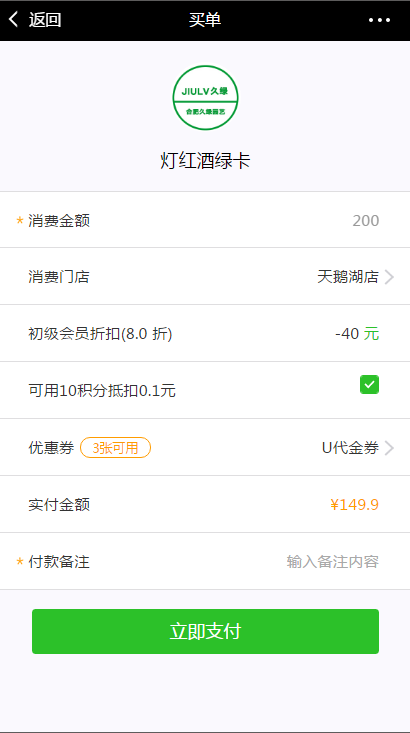 以小编使用APP端余额支付举例。当小编到某门店消费,付款时点击会员卡上的快速买单。如果满足支付后营销赠送规则,在支付成功页面,小编就可以看到本次支付后,门店给小编赠送的积分、经验值和优惠券奖励。