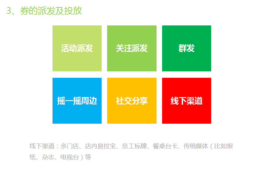 关注送券、群发投放优惠券、摇一摇周边投放优惠券、线下投放等渠道