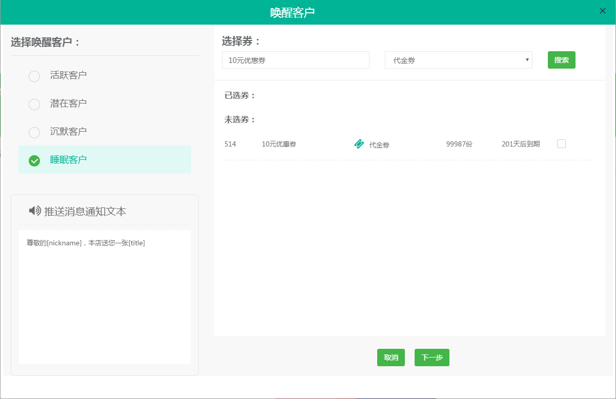 根据用户的不同属性,比如消费额度、是否是商家会员、积分多少等等,结合公众号类型,自动判断发券渠道,并进行优惠券的自动派发。
