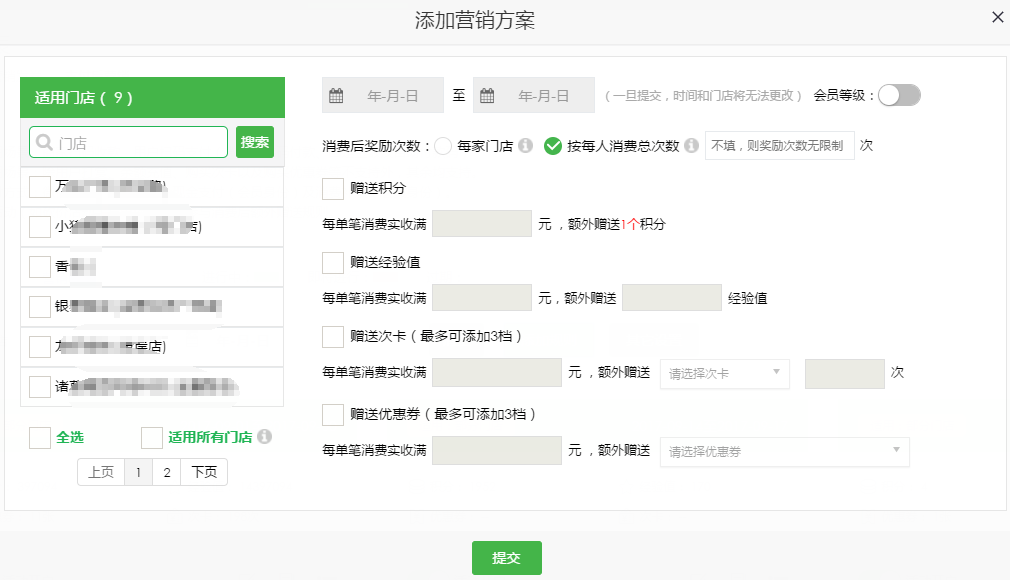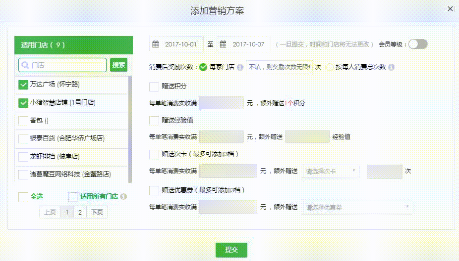 多门店商家可以选择部分或全部的门店,进行规则设置。
