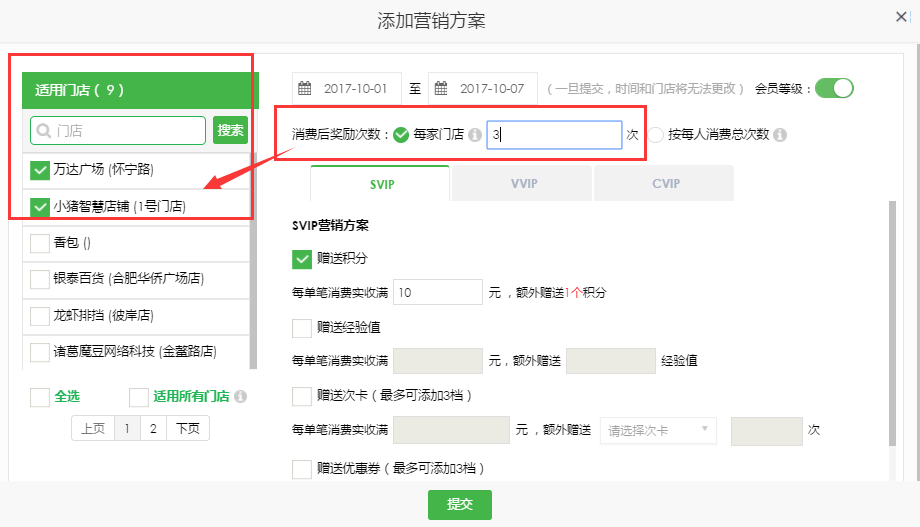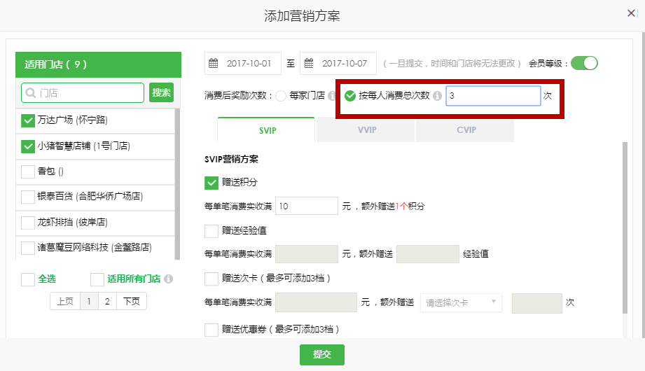 指会员在每家门店消费后,可享受多少次的额外奖励。若不填则奖励次数无限制。比如下图中填3次,那么会员在每家活动门店,均可最多享受三次赠送活动。