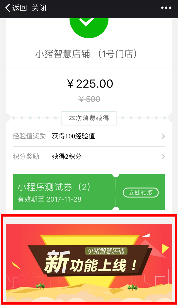● 为了提升商家活动的曝光度,添加广告图后,则在支付完成界面,可以看见商家的广告。