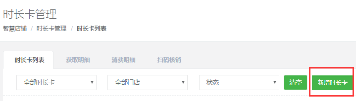 商家通过PC端后台【会员卡管理】进入【时长卡管理】页面。