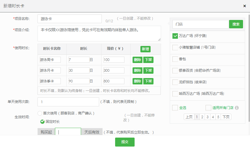 好铺管智慧店铺时长卡功能支持商家创建多档位时长卡,供不同需求用户选择购买。比如某个游泳馆可以设置周卡、月卡、季卡等。
