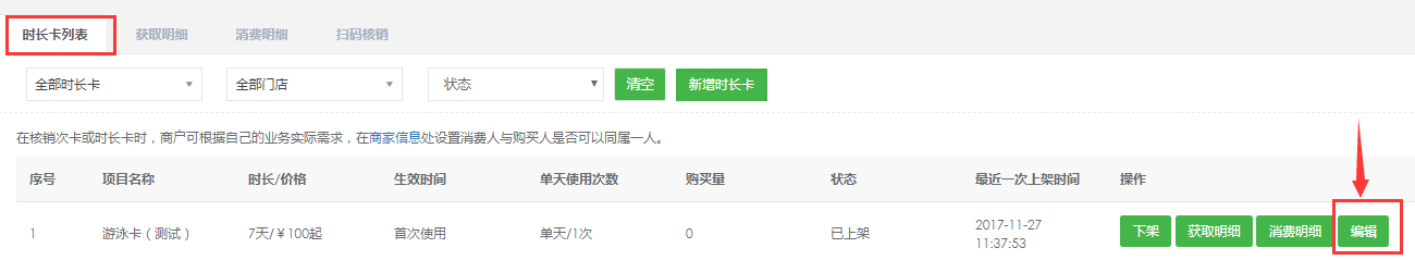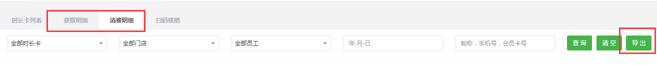商家:商家可在时长卡管理页面中查询时长卡的用户获取明细、消费明细,并将数据导出。