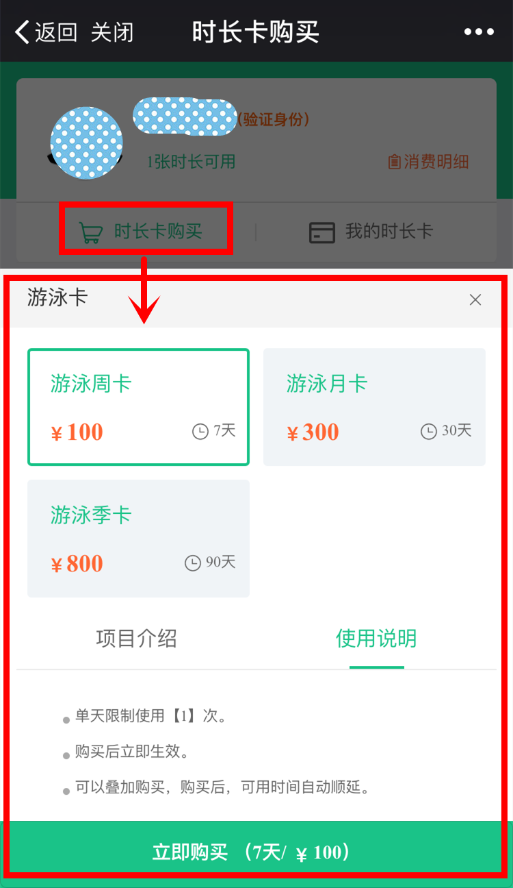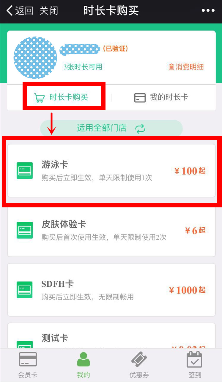 在这里,用户可以看到该门店在售的所有时长卡,并根据自己的需要进行购买。