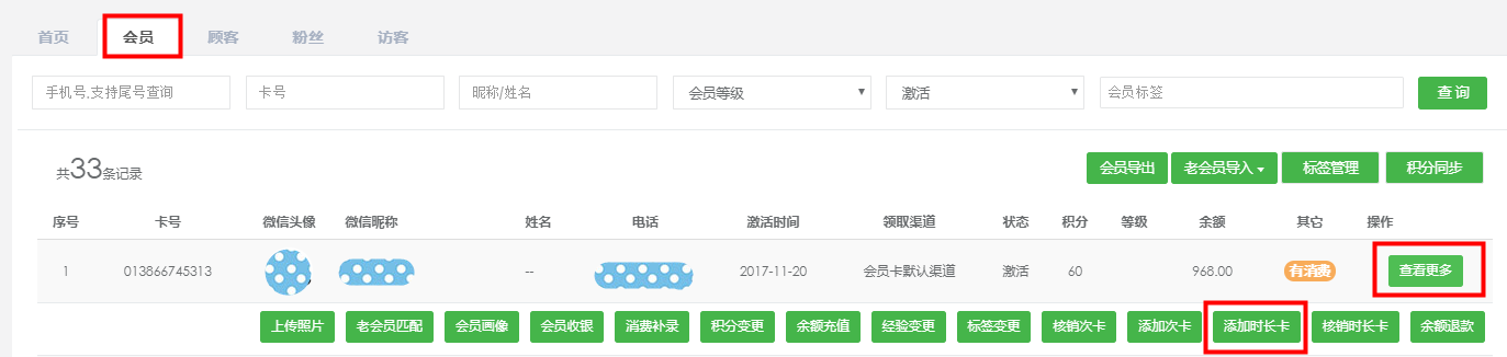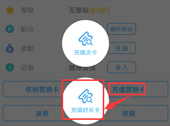 商家通过【会员信息】-【充值营销卡】-【充值时长卡】进入相应页面,即可为用户充值新的时长卡。