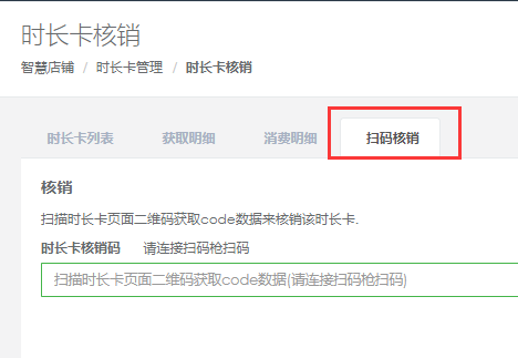 2.在时长卡管理页面点击【扫码核销】,通过扫描时长卡页面二维码获取code数据来核销该时长卡。