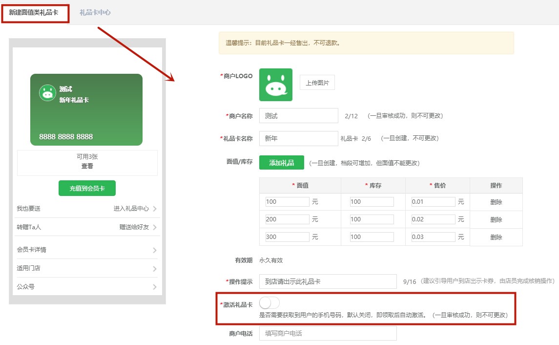 1.在新增面值类礼品卡时,会要求商家设置【是否需要获取到用户的手机号码,默认关闭,即领取后自动激活】,如果打开开关,则用户在激活礼品卡时,会要求其填写手机号;如果关闭,则领取礼品卡时,自动激活。
