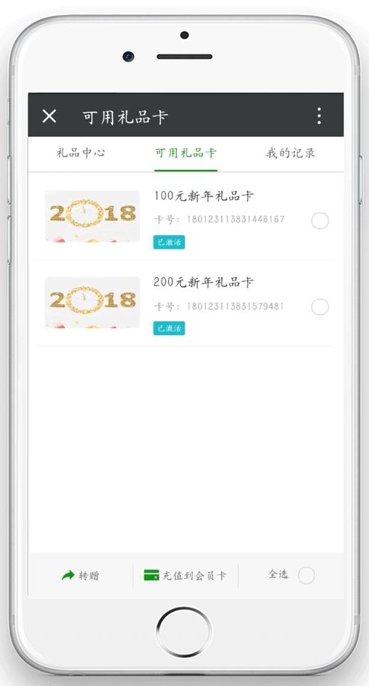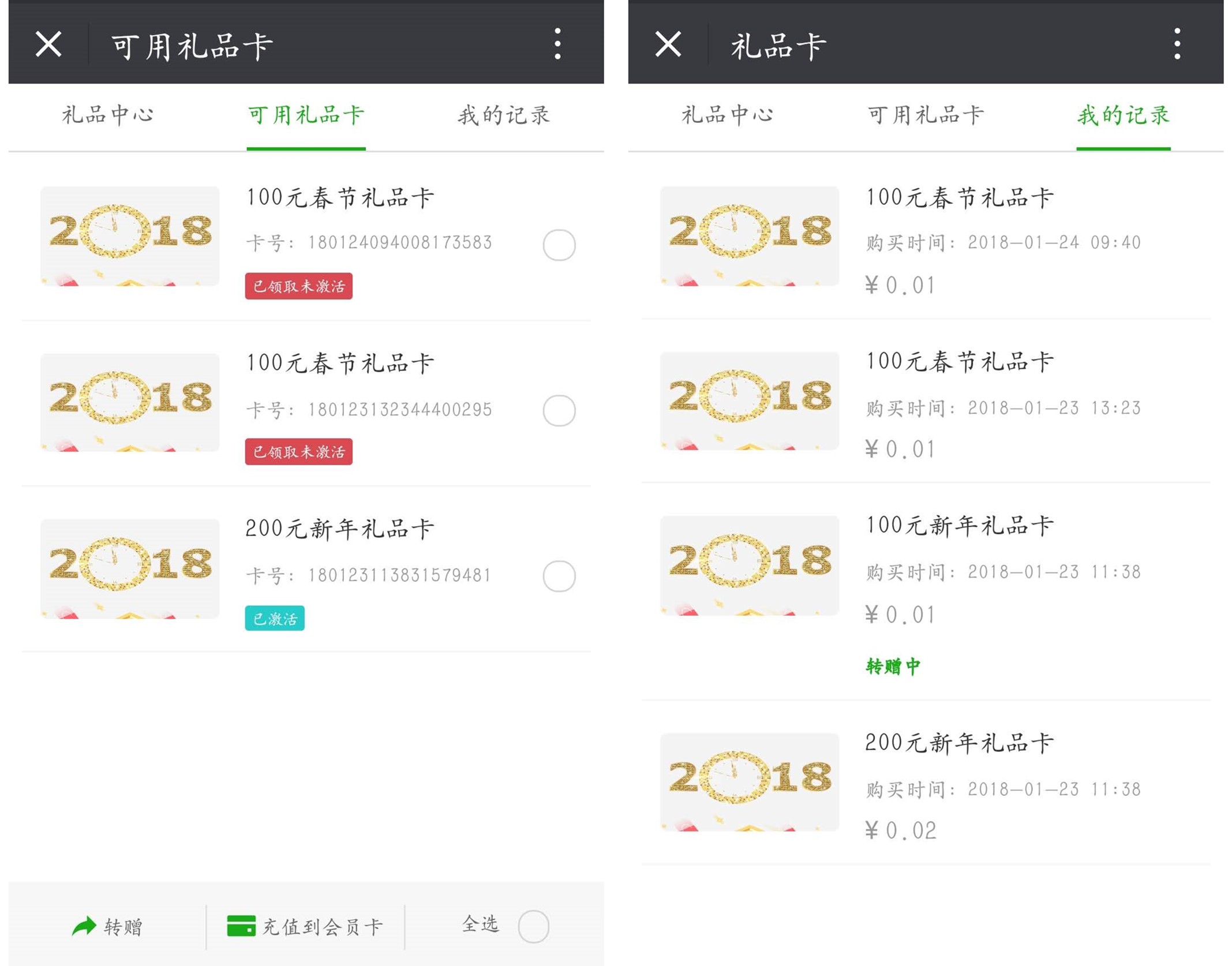 用户在手机端可以查看礼品卡的购买使用记录,以及当前状态(例如已领取未激活、已激活、转赠中等等)。